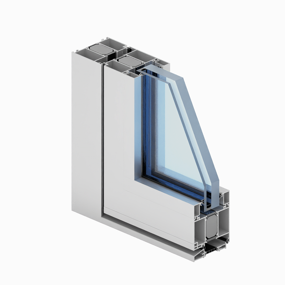 • Stavební hloubka systému 90 mm symetrická konstrukce profilu, centrální komora vyplněná sadrovými vložkami (mezi tepelnými mosty) pro EI30, všechny komory vyplněné sádrovými vložkami pro EI60 systém kompatibilní se systémem STAR 90 mm